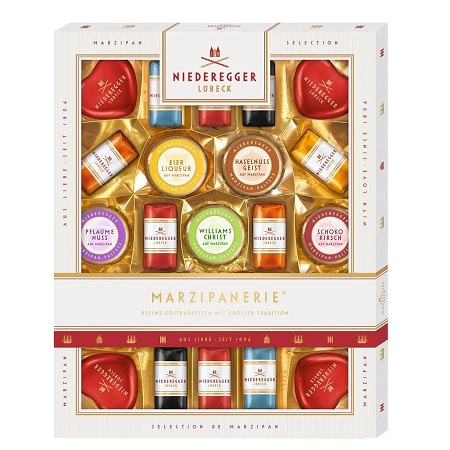 Состав: миндаль 37%, темный шоколад 28% (какао — масса, сахар, какао — масло, сухое цельное молоко, эмульгатор:, экстракт ванили), сахар, инвертный сахарный сироп, алкоголь, ананас, глюкозно — фруктозный сироп, белый шоколад (сахар, какао-масло, эмульгатор: , экстракт ванили), цедра апельсина, цельномолочный шоколад (сахар, какао-масло, какао тертое, эмульгатор: экстракт ванили), сливы ,натуральные ароматизаторы, фруктовый порошок сливы (сливы, мальтодекстрин), порошок апельсиновых фруктов (мальтодекстрин, апельсины, натуральный ароматизатор), растворимый кофе, апельсиновый ликер, арманьяк, масло, ром, яблоко, порошок фруктов ананаса (ананас, мальтодекстрин), Грушевый бренди Williams, яблочный сок из концентрированного фруктового сока, натуральный ароматизатор ананас, глюкозный сироп, сухое обезжиренное молоко, ароматизатор, подкислитель (лимон, — L (+) — винная кислота), натуральный ароматизатор апельсина, желирующий агент (пектин, Альгинат натрия), стабилизатор: пектин, апельсиновое масло.