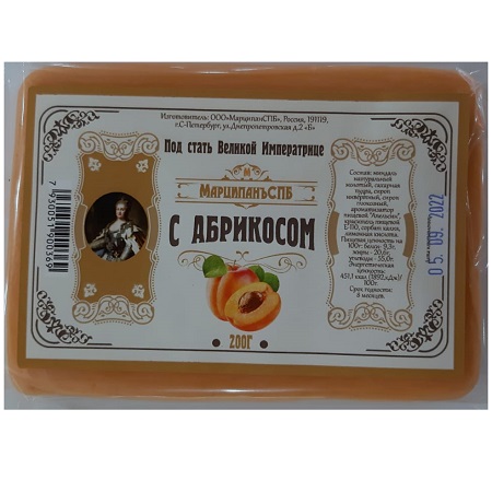 Состав: миндаль натуральный молотый, сахарная пудра, сироп инвертный, сироп глюкозный, ароматизатор пищевой «Абрикос», пищевой краситель E-102, Е-133, сорбат калия, лимонная кислота
