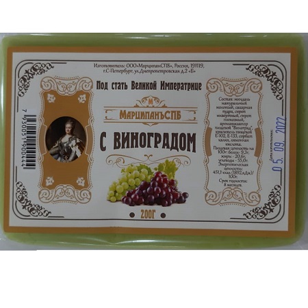 Состав: миндаль натуральный молотый, сахарная пудра, сироп инвертный, сироп глюкозный, ароматизатор пищевой «Виноград», пищевой краситель E-102, Е-133, сорбат калия, лимонная кислота