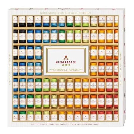 Состав: МИНДАЛЬ 37%, сахар, темный шоколад 20% (какао-масса, сахар, какао-масло, цельное сухое молоко, эмульгатор: соевый лецитин, экстракт ванили), цельномолочный шоколад 8,1% (сахар, какао-масло, цельное сухое молоко, какао-масса, эмульгатор: СОЯ-ЛЕЦИТИН, экстракт ванили), инвертный сахарный сироп, спирт, ананас, глюкозно-фруктозный сироп, ФИСТАШКИ, цедра апельсина, яблоко, джин, порошок из плодов апельсина (мальтодекстрин, апельсины, натуральный ароматизатор апельсин), ром, Фундук, кальвадос , натуральные ароматизаторы, сливовая вода Mirabelle, растворимый кофе, порошок фруктов ананаса (ананас, мальтодекстрин), натуральный ароматизатор яблока с другими натуральными ароматизаторами, препарат сушеного лимона (декстроза, мальтодекстрин, подкислитель: лимонная кислота, концентрат лимонного сока), натуральный ароматизатор ананаса, спиртной напиток (аррак), подкислитель: лимонная кислота.